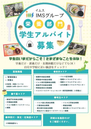 IMS栄養部門は、栄養科の業務において給食と栄養管理の品質改善を追求しています。学生の皆さんは、養成校にて、経験豊かな先生方から、給食・栄養管理について沢山学んだと思います。それなのに、就職してからは、給食管理だけ従事する、栄養管理だけ従事するというのはもったいない事だと思いませんか?IMS栄養部門は、セントラルキッチン工場にてIMS統一献立の開発を行いながら、サテライトキッチンである施設厨房では、患者・入所者に喜ばれる食事の提供を目指しています。一方で、グループメリットを生かしながら、栄養管理のスキルアップ教育を実践し、栄養サポートチーム(NST)や地域医療、地域貢献ができる管理栄養士を育成しています。社会人になって人生は長いです。その長い人生の中で、IMS栄養部門に所属し、私たちと一緒に患者が、利用者が、職員が、全てに関わる“みんなを笑顔に”しませんか。一緒にお仕事ができることを楽しみにしています。