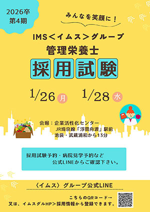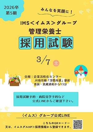 IMS栄養部門は、栄養科の業務において給食と栄養管理の品質改善を追求しています。学生の皆さんは、養成校にて、経験豊かな先生方から、給食・栄養管理について沢山学んだと思います。それなのに、就職してからは、給食管理だけ従事する、栄養管理だけ従事するというのはもったいない事だと思いませんか?IMS栄養部門は、セントラルキッチン工場にてIMS統一献立の開発を行いながら、サテライトキッチンである施設厨房では、患者・入所者に喜ばれる食事の提供を目指しています。一方で、グループメリットを生かしながら、栄養管理のスキルアップ教育を実践し、栄養サポートチーム(NST)や地域医療、地域貢献ができる管理栄養士を育成しています。社会人になって人生は長いです。その長い人生の中で、IMS栄養部門に所属し、私たちと一緒に患者が、利用者が、職員が、全てに関わる“みんなを笑顔に”しませんか。一緒にお仕事ができることを楽しみにしています。