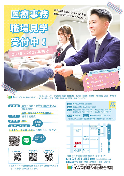 - 事務総合職・経理管理職・営業職いずれも医療知識は入職してからIMSグループ独自の教育プログラム「IMS SCHOOL」で勉強します。