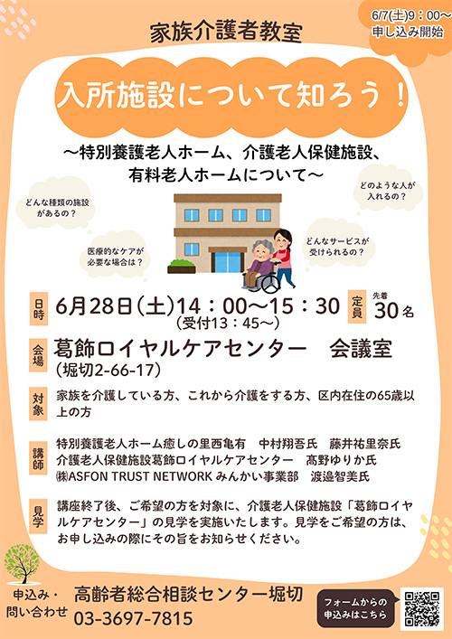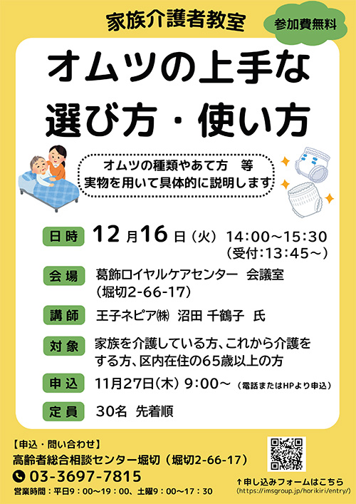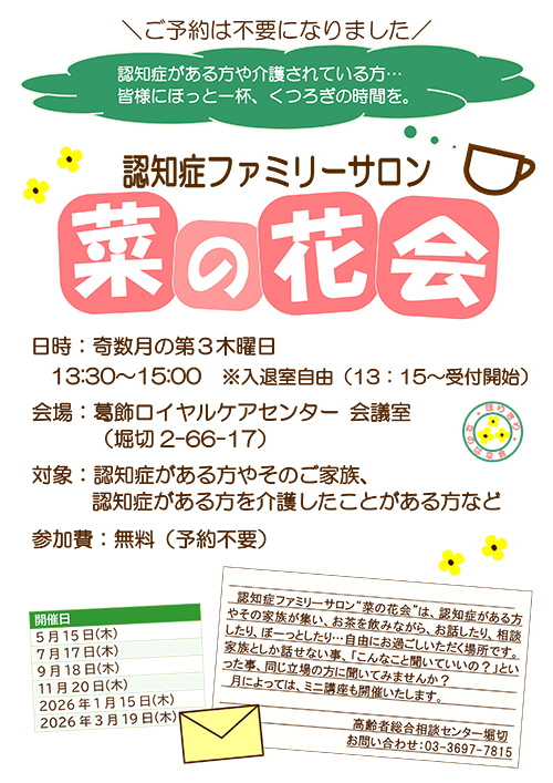 開催日 2025年12月16日(火) 時間 14:00~15:30(13:45~受付開始) 会場 葛飾ロイヤルケアセンター 会議室(堀切2-66-17) 参加費 無料 申込み 11月27日(木)9:00から電話・メールフォームより申し込みください。 その他 -