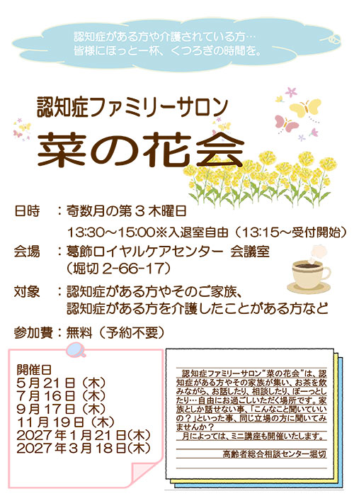 (13:45~受付開始)会場 葛飾ロイヤルケアセンター 参加費 100円(飲み物代) 申込み 事前予約は不要です その他