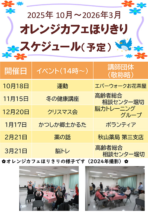 開催日 毎月第3土曜日 時間 14:00~15:00(出入り自由) 会場 葛飾ロイヤルケアセンター 参加費 100円(飲み物代) 申込み 事前予約は不要です -