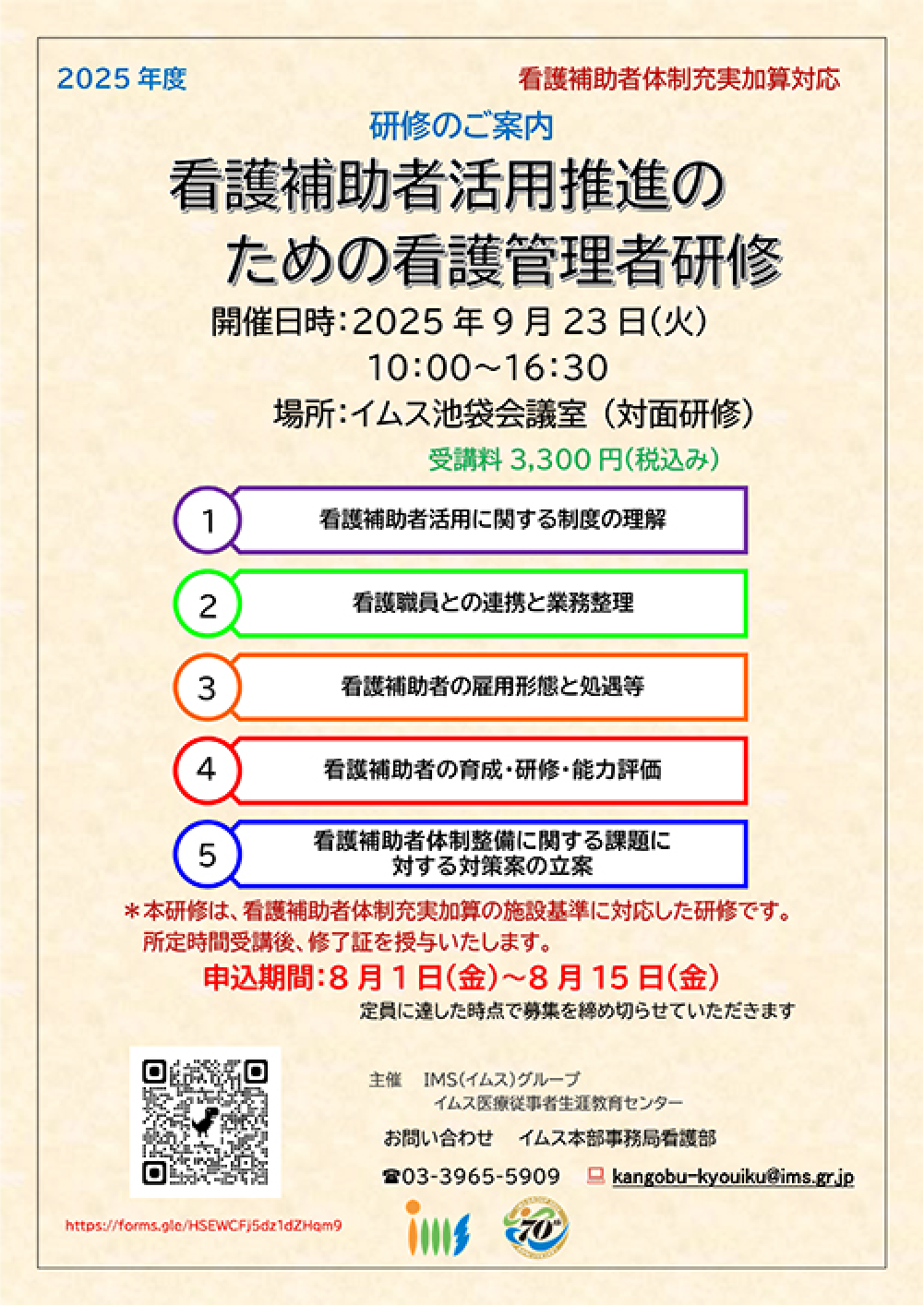 | 対象者 | 看護管理者 定員50名(定員に達した時点で募集を締め切らせていただきます。) ※『看護補助体制充実加算』対象のため、修了証書が発行されます |
