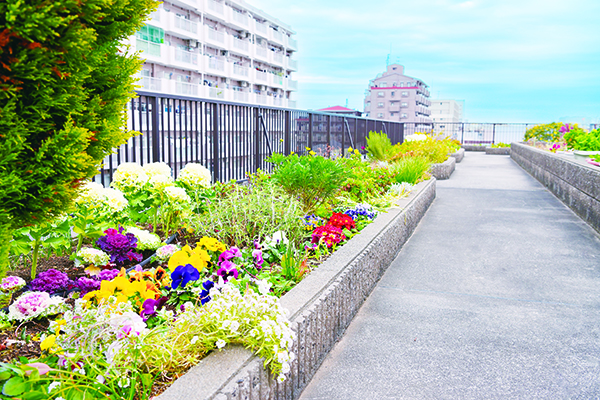 四季折々に花が咲く、陽当りの良い屋上庭園は心安らぐスペース。