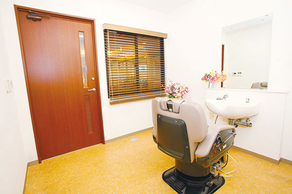 特別浴室では介助付きで機械による寝台浴も可能。重介護の入居者さまも横になったままお風呂を利用できる。各フロアに個人浴室も設置している