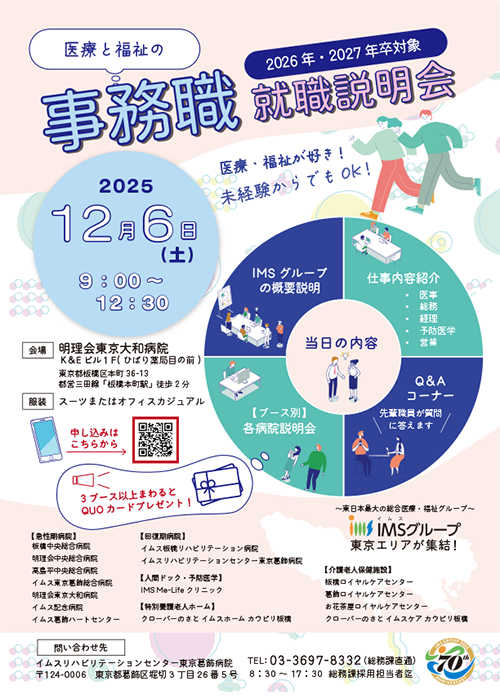 - 事務総合職・経理管理職・営業職いずれも医療知識は入職してからIMSグループ独自の教育プログラム「IMS SCHOOL」で勉強します。