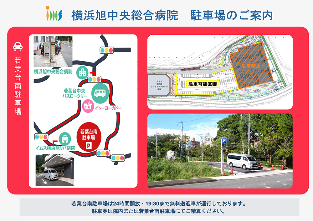 - 南駐車場へご駐車後、無料送迎車で病院までお越しください。