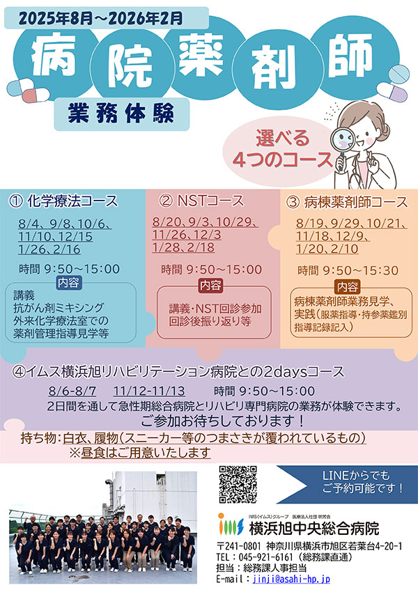 病棟業務/中央業務(内服調剤・注射調剤)/無菌製剤業務/服薬指導/各種チーム活動/委員会活動等